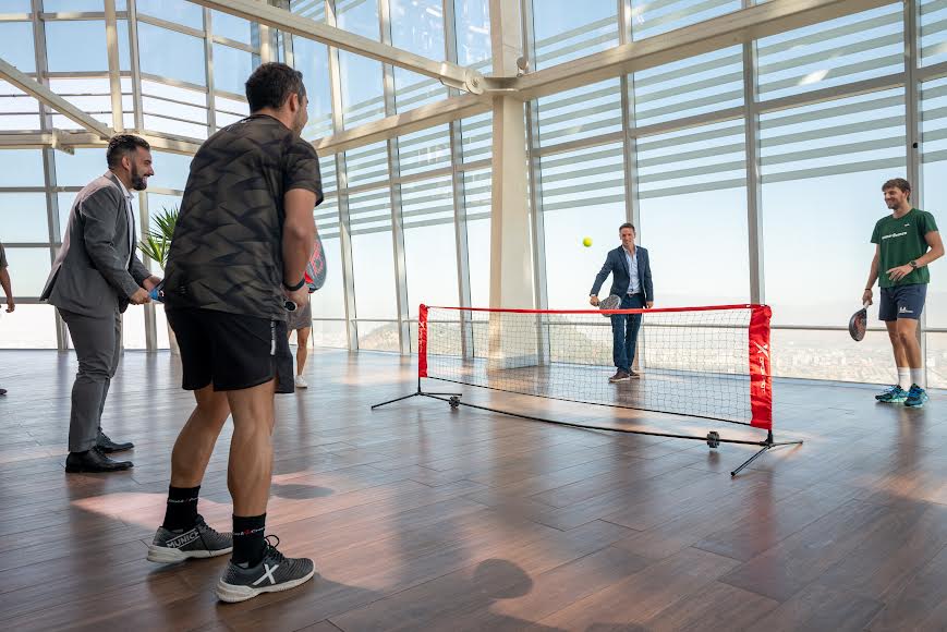 El español Miguel Yanguas, la pala número 1 de Chile Javier Valdés, junto al CEO del World Padel Tour Lisandro Borges y Jorge “Mago” Valdivia, realizaron una demostración en el Sky Costanera, para publicitar un apronte del BTG Pactual Chile Pádel Open.